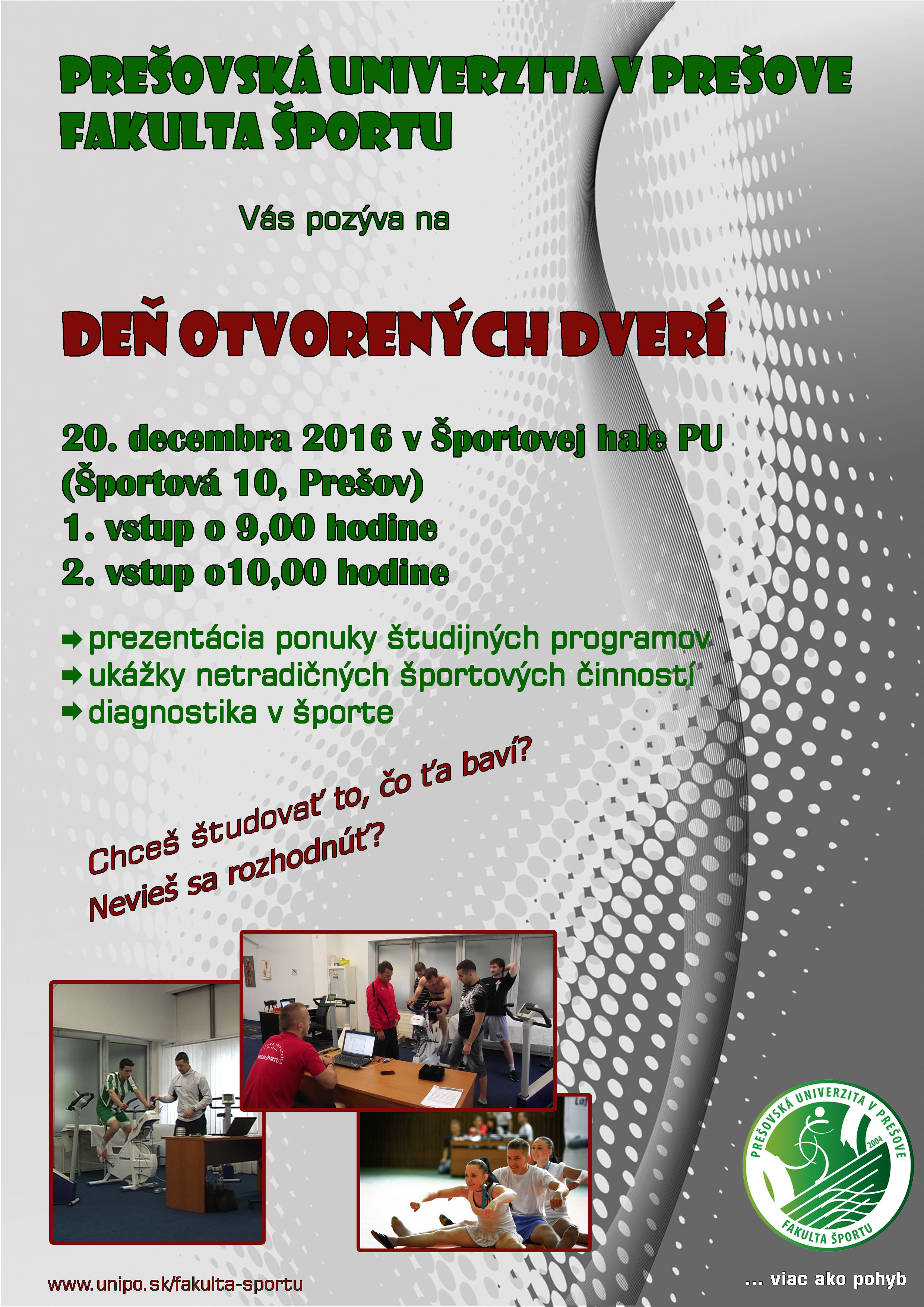 Fakulta športu Prešovskej univerzity v Prešove Vás pozýva na DEŇ OTVORENÝCH DVERÍ, ktorý sa bude konať dňa 20. decembra 2016 v Športovej hale PU (Športová 10, Prešov).